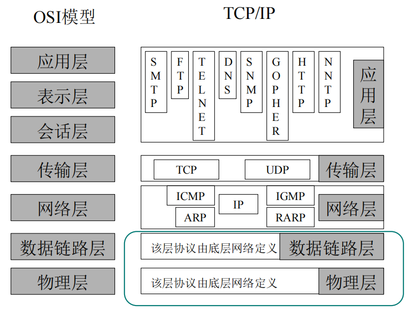 - TCP/IP 模型: 事实上的工业标准。通常分为4层(应用层、传输层、网络层、网络接口层)或5层(加上物理层)。